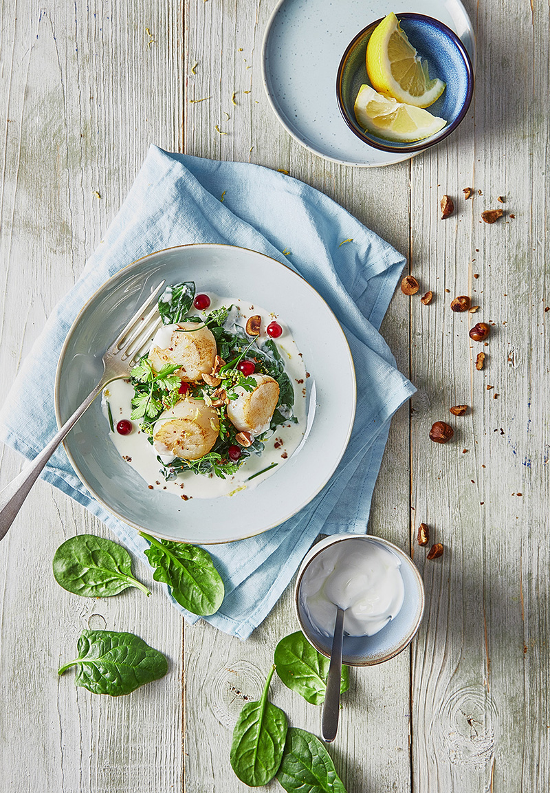 Noix de Saint-Jacques et épinards à la Crème Fraîche Chavroux®, groseilles et noisettes grillées