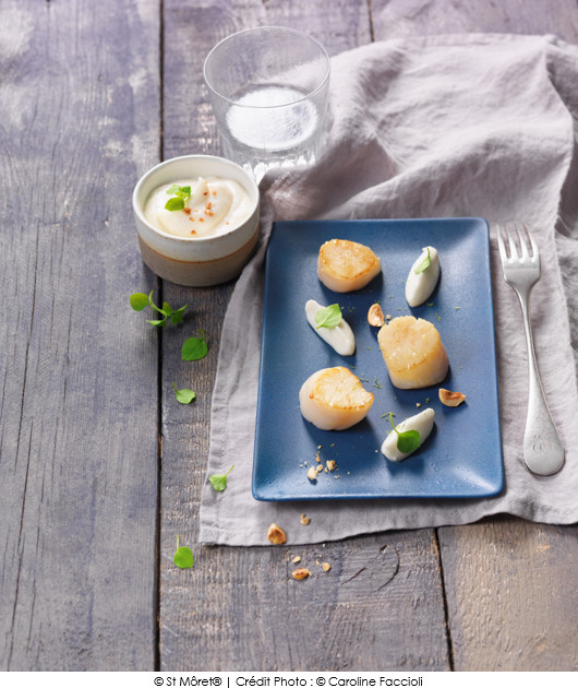 Noix de Saint-Jacques rôties aux noisettes et crémeuse de topinambours au St Môret®