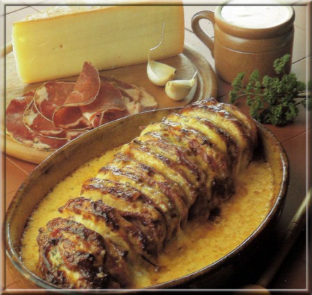 3-Sortir le plat du four et couper la viande en tranches fines. Intercaler entre chacune une tranche de bacon et une lamelle de fromage (garder 50 g de fromage pour la suite). Ficeler le rôti.