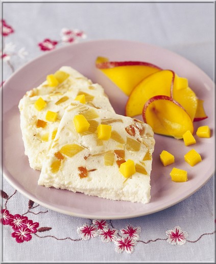 13 – Au moment de servir, démouler le nougat glacé sur un plat. Laver la deuxième mangue et la couper en dés, sans la peler.