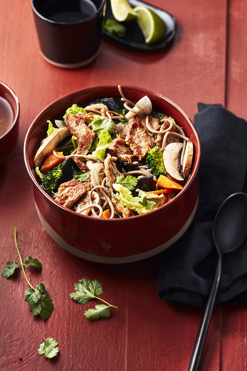 ⑧• Servir les nouilles soba dans des bols et verser le bouillon avec l’émincé de veau et les légumes.