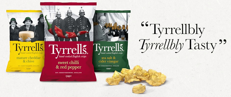 Depuis leur naissance en 2002 à la ferme de Tyrrells® Court, dans le très pittoresque Herefordshire, Tyrrells a fait le tour du monde et régalé des milliers de gourmets. Le secret ? Des pommes de terre soigneusement choisies selon les saisons et les variétés, assaisonnées à la perfection avec les meilleurs ingrédients, cuites avec la peau pour des chips hyper ondulées, au croustillant inimitable et pleines de caractère. Chips de pommes de terre ou de légumes, Tyrrells propose un éventail de gourmandises avec plus d’une vingtaine de références vendues en GMS et en circuits d’impulsion.