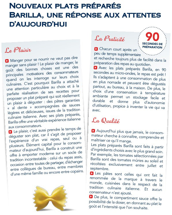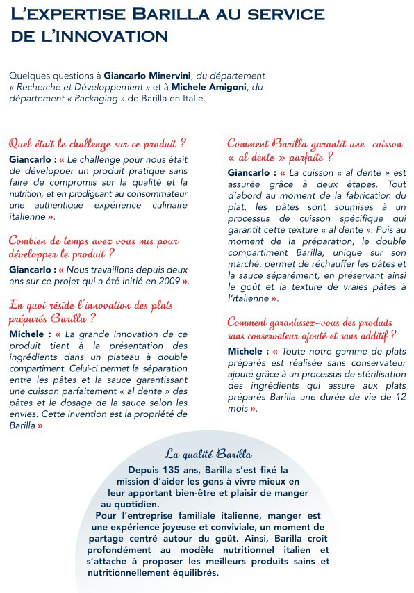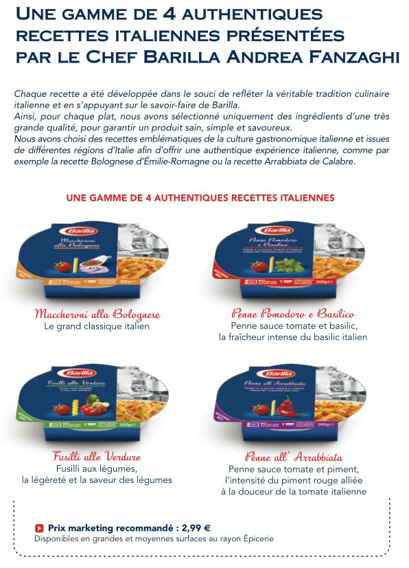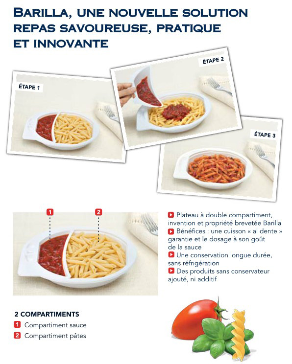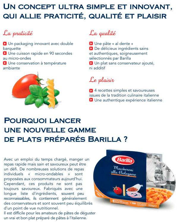 Avec ses plats préparés, Barilla met une innovation technologique au service de la tradition culinaire italienne. En trois gestes très simples et 90 secondes au four à micro-ondes, le véritable plat de pâtes à l’italienne n’a jamais été aussi bon, pratique et accessible.