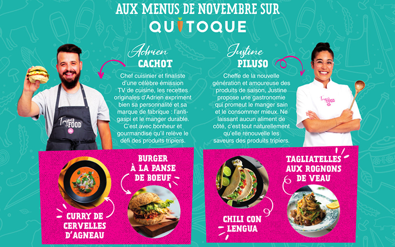 En livraison du 9 novembre au 5 décembre 2020, 4 recettes de Produits Tripiers prêtes à cuisiner, et imaginées spécialement pour cette 20ème Édition par les Chefs Adrien Cachot et Justine Piluso. seront disponibles sur quitoque.fr, le n°1 des paniers à cuisiner en France. Pour découvrir ces savoureuses recettes, tous les produits frais et les fiches-recettes détaillées seront dans le panier, il n’y aura plus qu’à cuisiner et à déguster !