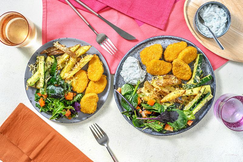 Nuggets de blé sauce ranch & frites de courgettes, salade de jeunes pousses