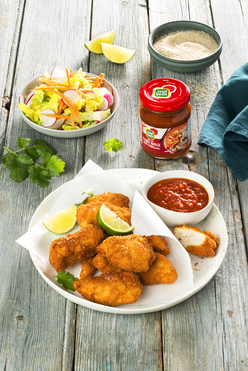 Servez les nuggets avec la sauce, du citron vert, quelques feuilles de coriandre et une petite salade de crudités.