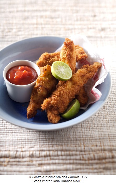1• Découper les escalopes en petites lanières puis les saler et les poivrer. Tremper les morceaux d'escalopes dans la farine puis dans œuf battu et enfin dans la chapelure.