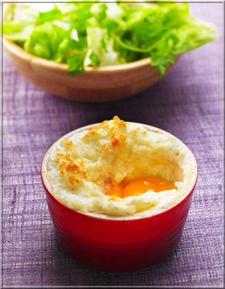 4- Remplissez les ramequins au tiers de leur hauteur avec les blancs battus, puis déposez délicatement 2 jaunes au-dessus et recouvrez-les avec le reste des blancs. Parsemez à la surface le reste du parmesan et enfournez pour 5 min. Les jaunes doivent rester moelleux.