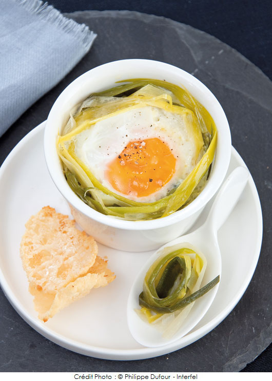 Œuf cocotte et fondue de poireaux primeurs, tuile au parmesan