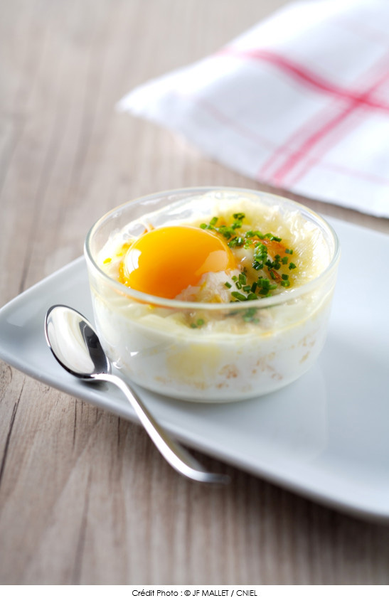 ②• Peler et évider la pomme. La découper en petits dés à répartir au fond de 4 ramequins beurrés. Ajouter équitablement les morceaux de fromage. Poivrer et verser une cuillère à soupe de crème liquide dans chaque ramequin. Casser les œufs, les déposer. Filmer et percer, cuire 30 à 40 secondes à puissance moyenne au micro-ondes (en surveillant la cuisson).