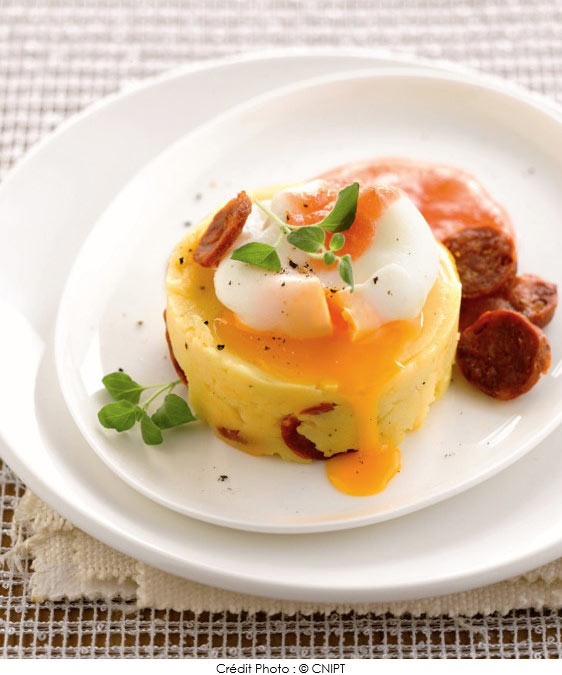 Œuf poché, purée de pommes de terre au chorizo et coulis de tomate