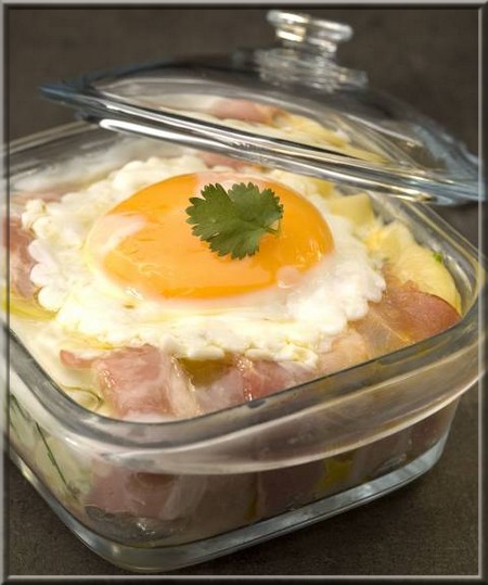 6.Égoutter les pâtes, les répartir dans les ramequins. Napper de crème au parmesan. Faire revenir les tranches de lard sur l’ensemble, casser les œufs dessus et assaisonner.