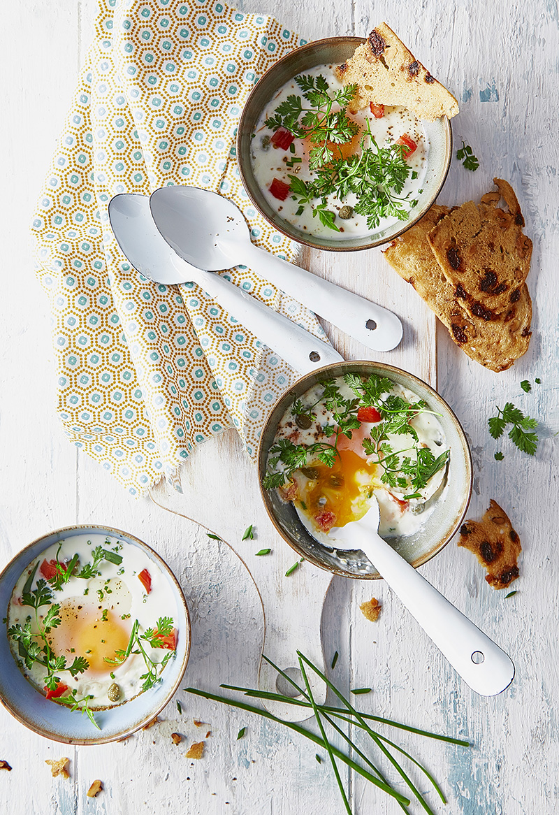 Œufs cocotte à la Crème Fraîche Chavroux®, tomates confites et câpres aux herbes