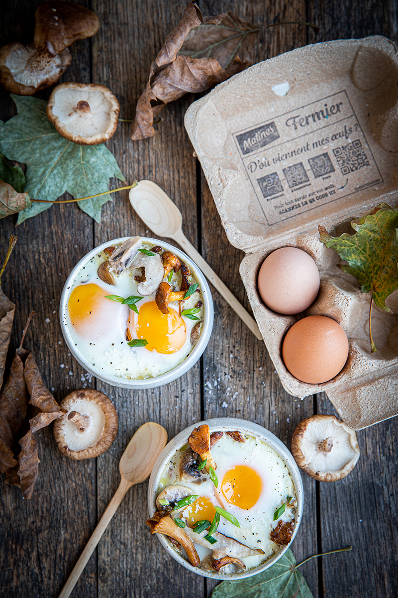 ⑤• Répartir la poêlée de champignons dans des mini-cocottes, puis casser 2 œufs sans briser les jaunes et les disposer dessus.