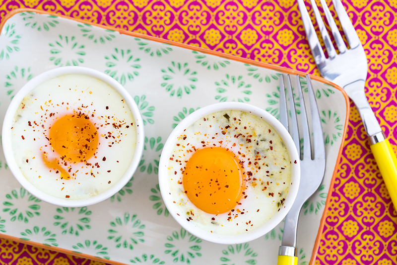 ④• Casser délicatement 1 œuf dans chaque ramequin. Ajouter le piment de Cayenne.
