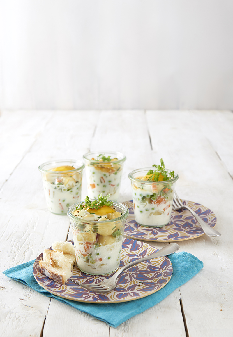 Œufs cocotte aux Ratte du Touquet, carotte et petit pois
