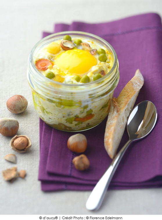Œufs cocottes et poêlée jardinière à la ricotta parsemés de noisettes grillées