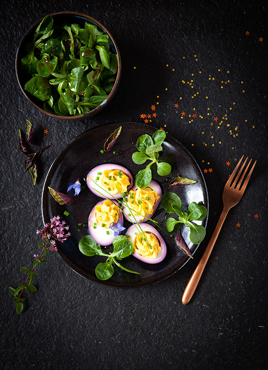 les œufs colorés en violet et relevés d’une note de gingembre,