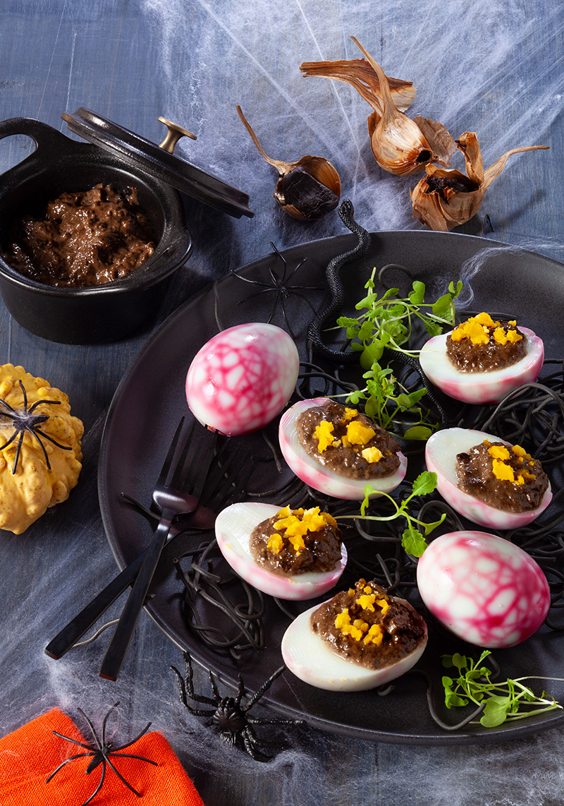 Remplir les blancs marbrés de cette mayonnaise noire et servir les œufs aussitôt pour Halloween !