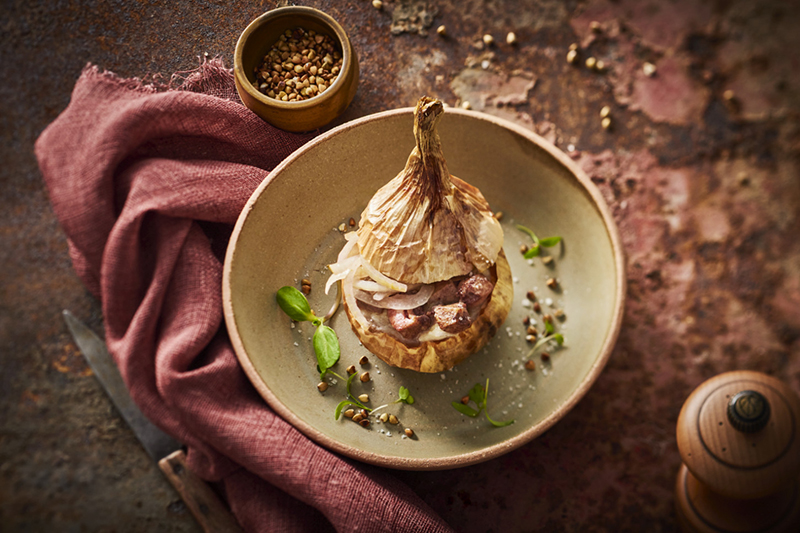 Pour le dressage, déposer quelques pickles d'oignons sur les oignons entiers garnis et reposer la tête de l'oignon pour fermer tout en laissant apparaitre le rognon en dessous.