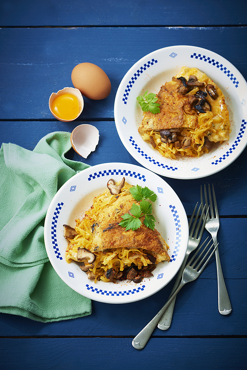 Stoppez le feu et versez dessus les pâtes croustillantes, pliez votre omelette, parsemez de persil frais et servez aussitôt.