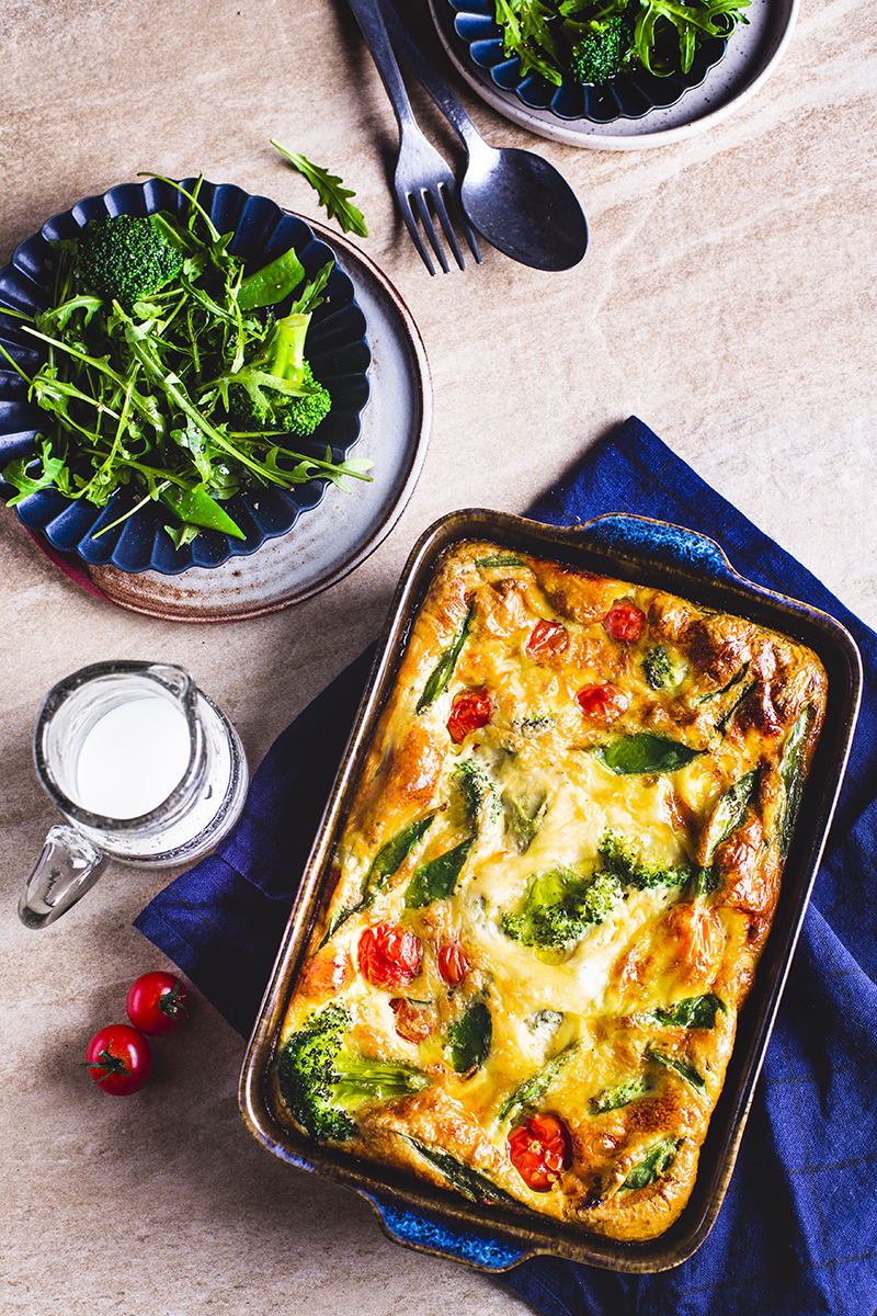③• Fouettez les œufs avec le lait, salez, poivrez et ajoutez l’emmental. Beurrez l’intérieur d’un plat à gratin, disposez les légumes verts et les tomates cerises dans le fond du plat.