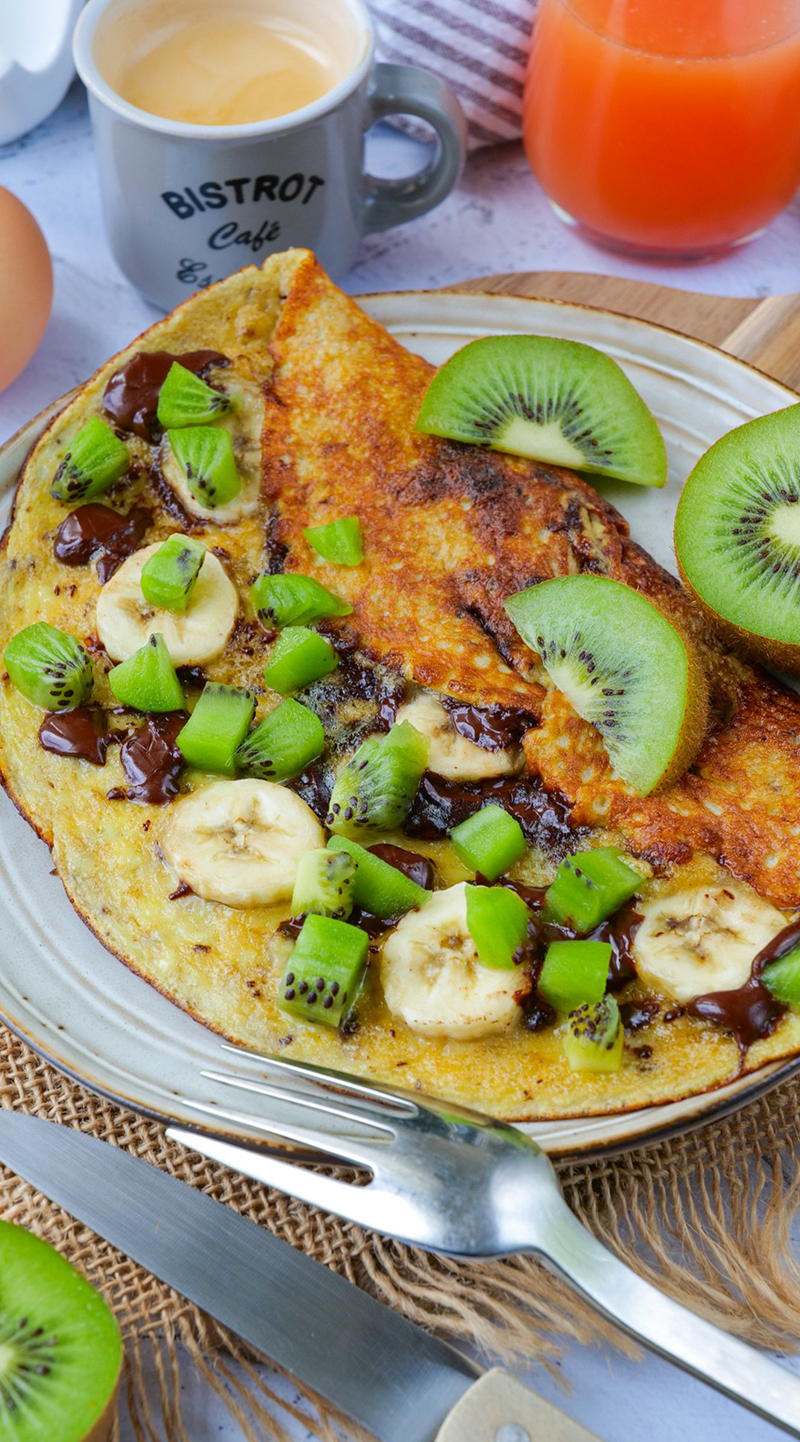 Une omelette sucrée gourmande avec des bananes fondantes, des kiwis frais et une touche de chocolat fondant. Parfaite pour un petit-déjeuner ou un dessert rapide et délicieux !