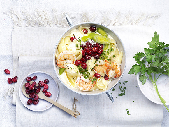 Ce plat vous rappellera un déjeuner en bord de mer : des poireaux et des cranberries associés à des crevettes et à des conchiglies. Cuisiner tous ensemble, ils donnent un plat « One-pot », qui ne donne pas seulement un goût de plat méditerranéen mais éveille aussi des sentiments d’été. Une recette légère pour des moments spéciaux.