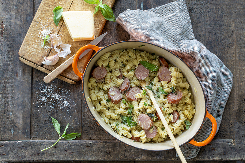 One pot pasta au beurre Charentes-Poitou AOP, saucisse fumée, ail, basilic et parmesan