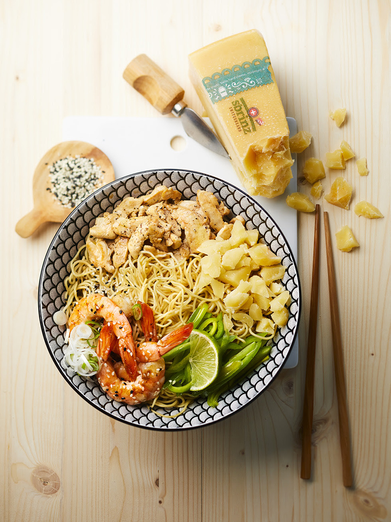 One Pot Pasta Noodle façon asiatique, poulet, crevettes et Sbrinz AOP
