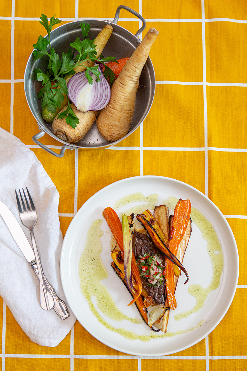 Onglet grillé, légumes anciens rôtis au sirop d’érable, sauce chimichurri