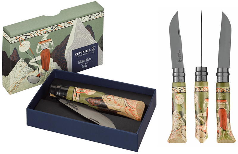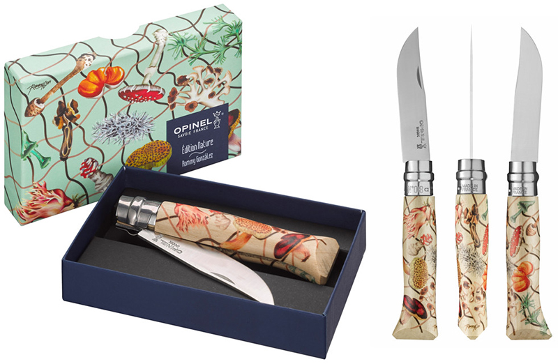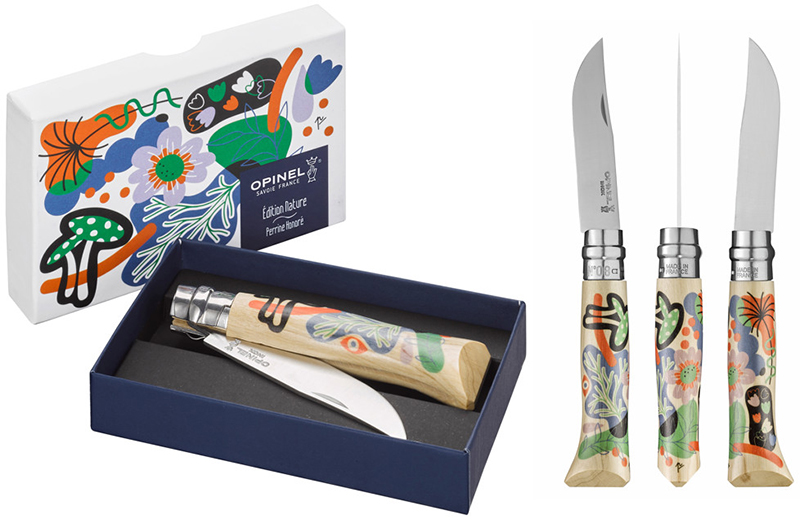 Avec trois artistes engagés dans les dimensions végétales, animales ou organiques : Mioshe, Rommy González, Perrine Honoré. Plantes comestibles et sauvages, aromatiques, champignons ou compositions florales et références mythologiques encrent cette nouvelle édition de l’iconique numéro 08. Manche en charme avec décor en sublimation. Lame en acier inoxydable. Lame/viroles noires pour le couteau Mioshe.
