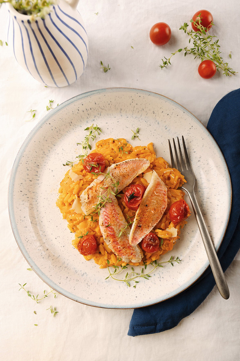 Orzotto aux tomates rôties à l’ail, rouget barbet cuit à la plancha