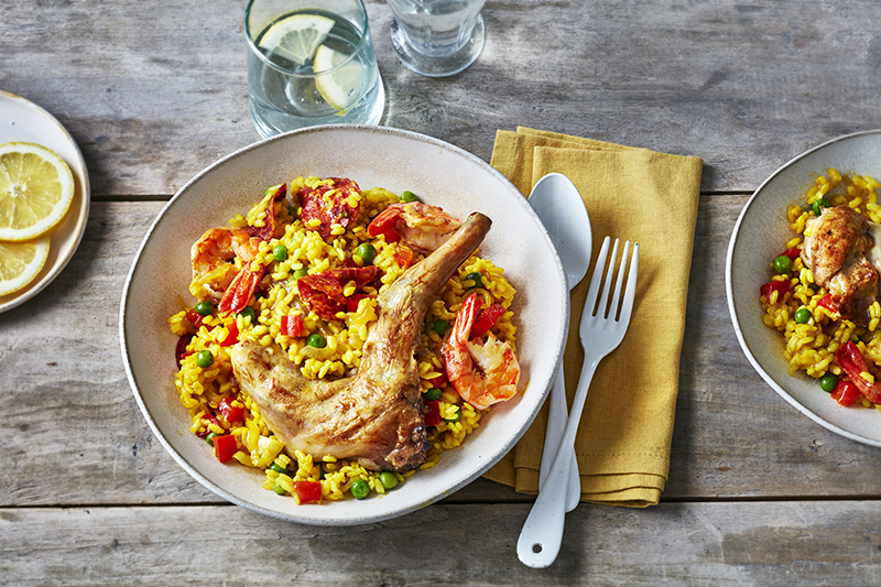 ⑦• Dans une poêle bien chaude, saisir les gambas. Poursuivre la cuisson du riz pendant 10 à 12 minutes jusqu’à ce qu’il soit cuit et la paëlla onctueuse.