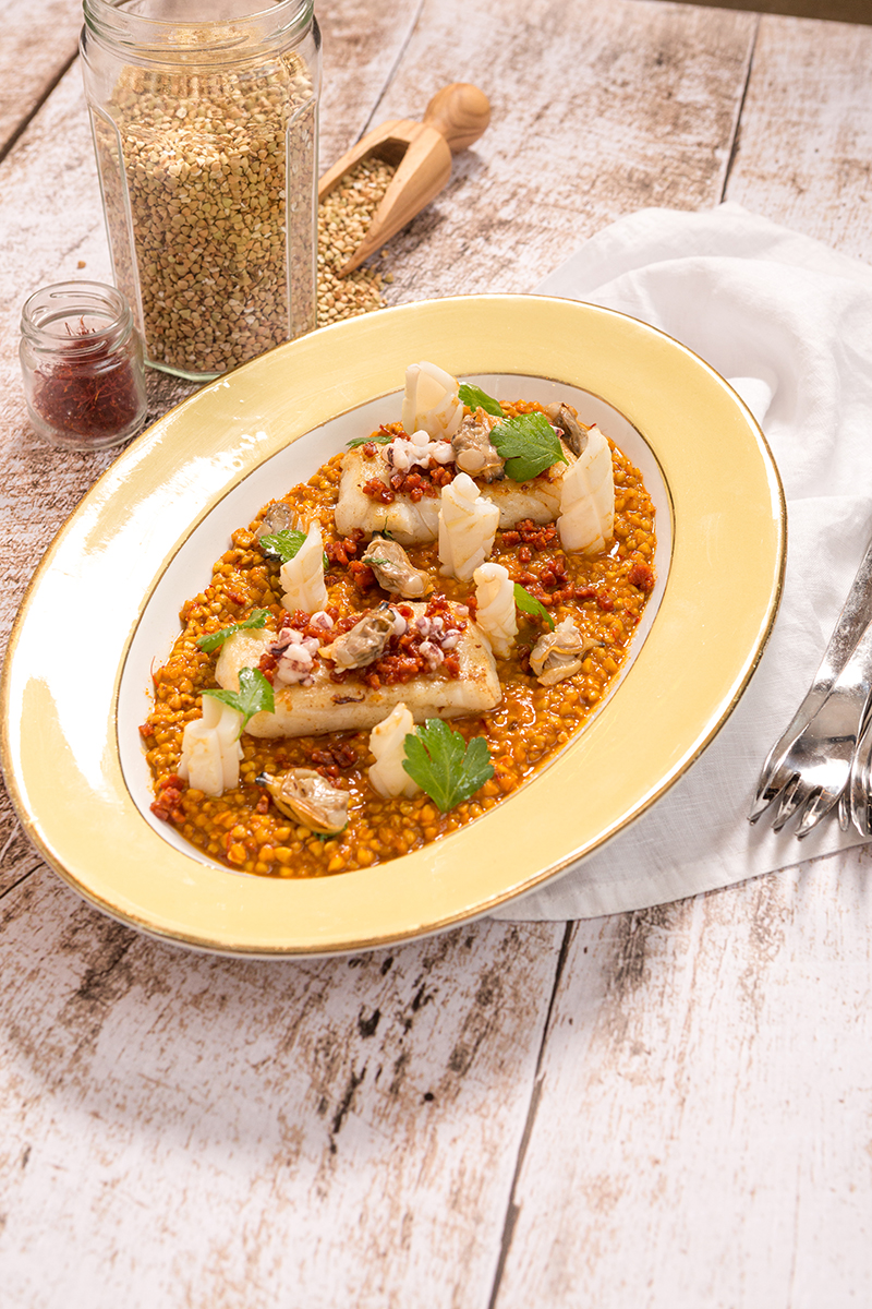 ⑥• Dressage : dans un plat, disposez le sarrasin dans le fond. Ajoutez les filets de merlu. Continuez en déposant les calamars, les palourdes et le chorizo.