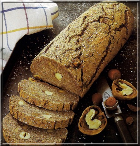 2.Mettre les deux farine et le sel dans une grande coupe.Y mélanger les noix et les noisettes.Ajouter la levure,les jaunes d'œufs et l'eau.Pétrir jusqu'à ce que la pâte ne colle plus aux mains.Couvrir et laisser reposer 2 h.La pâte doit doubler de volume.