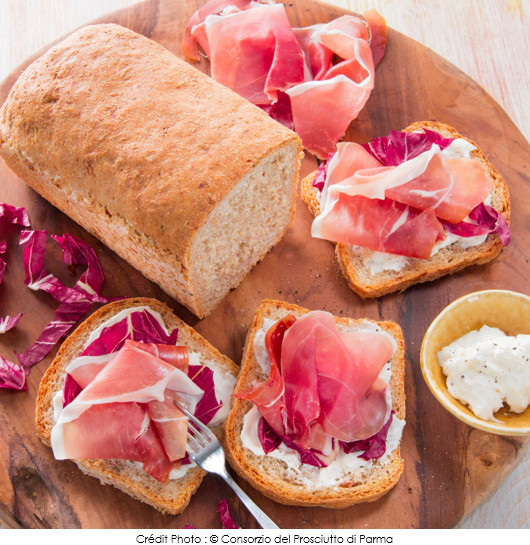 Pain complet au jambon de Parme, sauge, stracchino et trévise