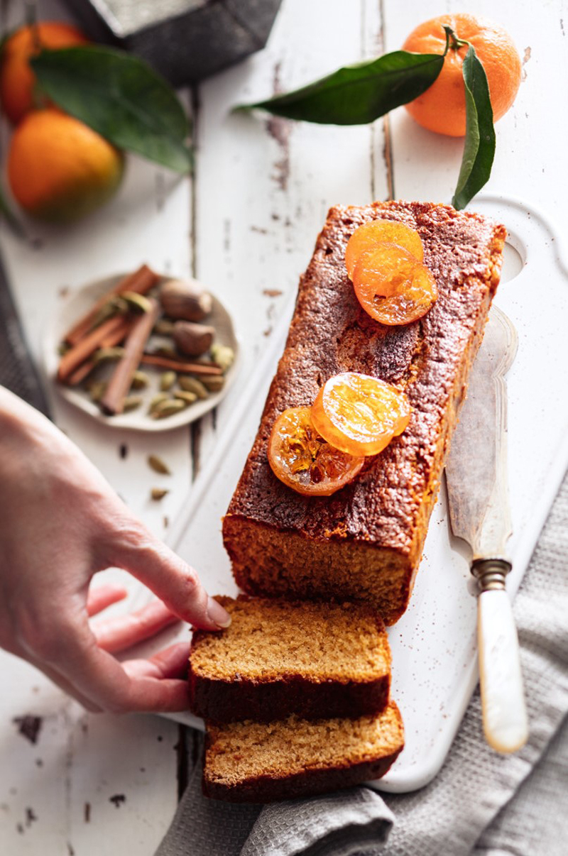 Détailler de jolies tranches de clémentines confites et en décorer le pain d’épices.