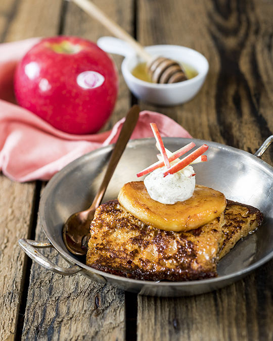 Pain d’épices façon pain perdu, Pink Lady® crue et caramélisée, crème au mascarpone vanillé