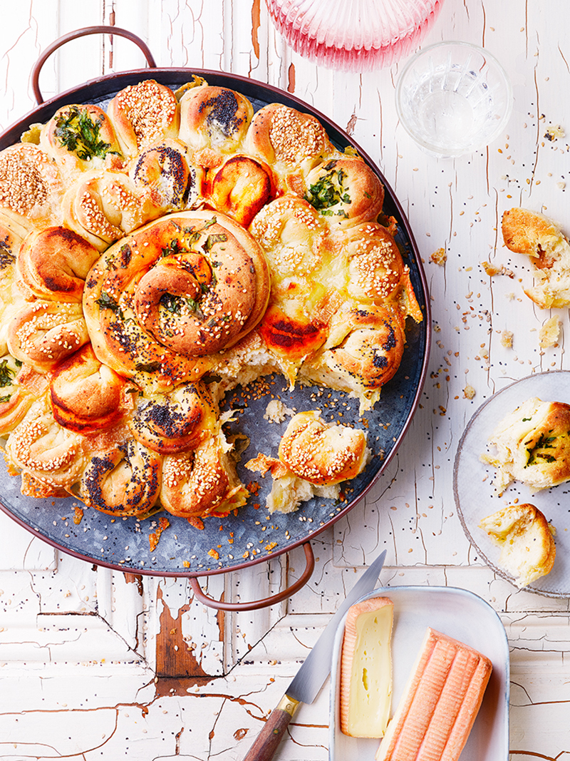 ⑤• Procédez de même avec tous les disques de pâte, en alternant les assaisonnements. Enfin, disposez du maroilles sur l’ovale de pâte restante, repliez, en deux puis roulez le tout sur lui-même et posez-le au centre du plat. Ajoutez les dés de Maroilles restants entre les pétales de pâte et laissez lever pendant encore 30 minutes.