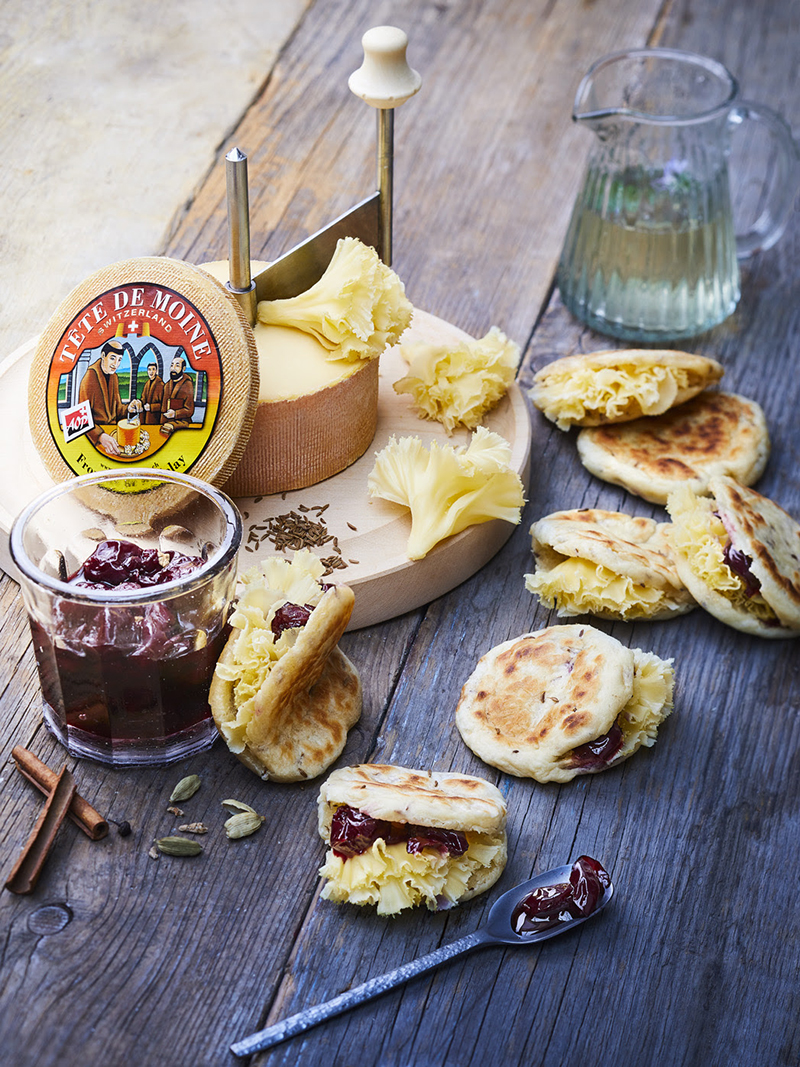 Pain Indien aux graines de cavi, chutney de cerise, Tête de Moine AOP