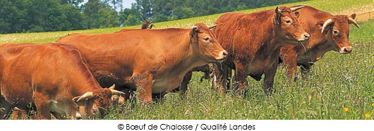 Trois races nobles sont éligibles à l’appellation « bœuf de Chalosse » : Blonde d’Aquitaine, Limousine et Bazadaise. Avec sa viande très tendre et persillée, au bon goût de noisette, ce bœuf renommé figurait déjà dans le Trésor gastronomique de France de Curnonsky en 1933.