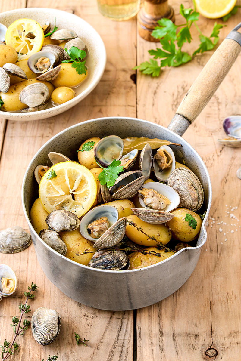 ①• Laver les palourdes pour retirer le sable éventuel. Frotter les pommes de terre sans retirer la peau.