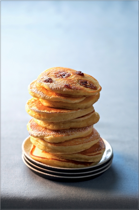 7• Peler les bananes, les couper en rondelles, en disposer 1 ou 2 dans une petite poêle avec une noisette de beurre, verser 1 cuil. à soupe de pâte et faire cuire les pancakes 3 min sur une face et 2 min sur l’autre.