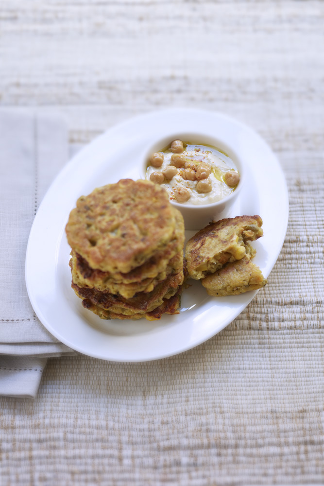 Servez les pancakes aussitôt, accompagnés de houmous que vous additionnez de pois chiches, huile d’olive et piment.
