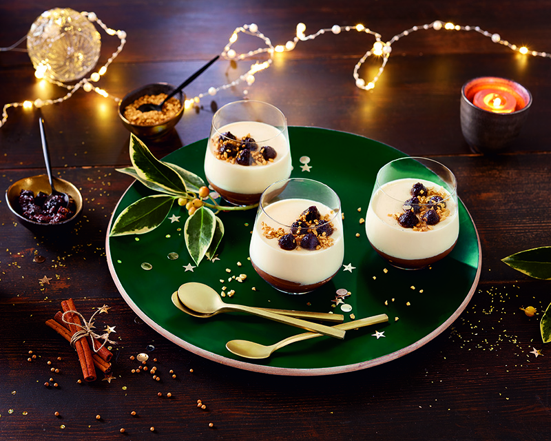④• Dresser les verrines en disposant 2 cuillères à soupe de crème de marron au fond, puis la panna cotta. Réserver 2 h au frais.