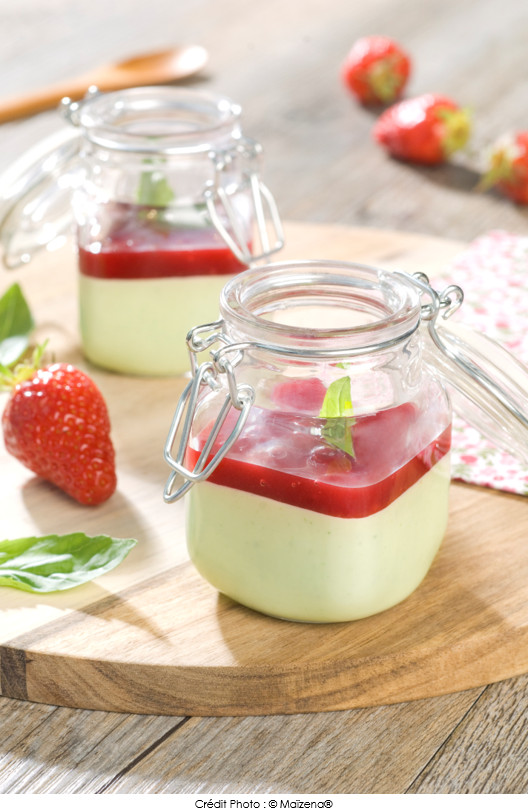 Panna cotta chocolat blanc/basilic, et coulis de fraise