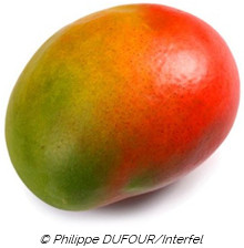 • Une mangue pèse 400 grammes en moyenne. Selon les variétés, sa peau peut être jaune, verte ou rouge. La mangue possède une chair onctueuse et parfumée, de couleur jaune-orangé.