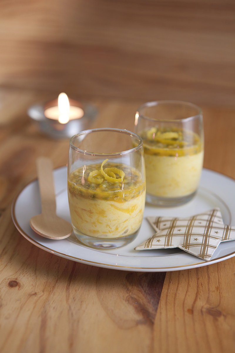Venue d’Italie, la panna cotta est devenue un grand classique sur nos tables. Celle-ci est parfumée à la chair de mangue et nappée de fruits de la Passion, un délice !