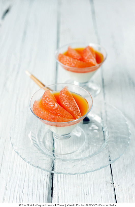 Juste avant de servir déposez 3 suprêmes de pamplemousse sur chaque panna cotta et dégustez sans attendre.